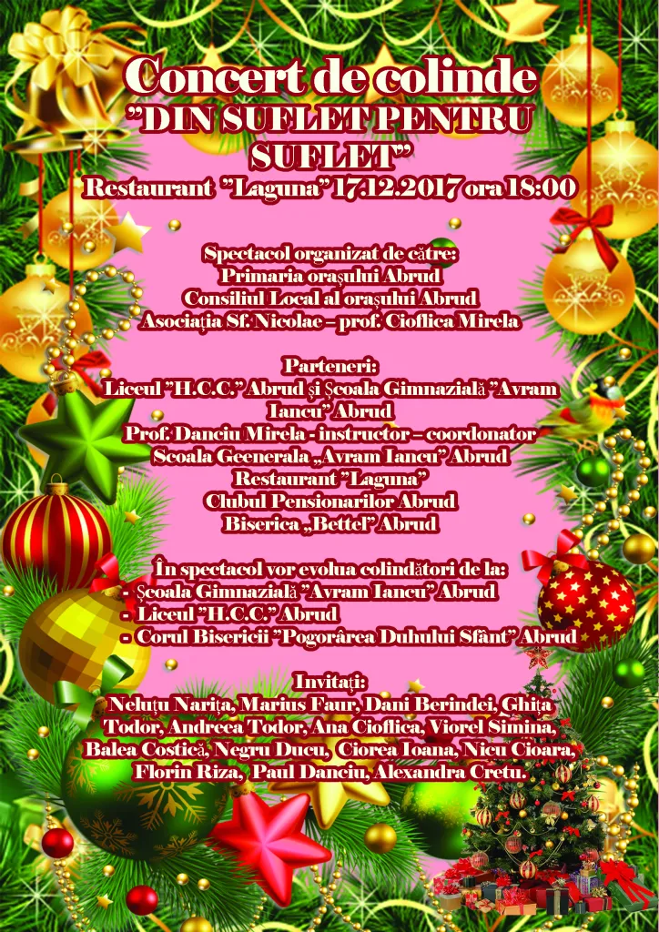Primăria orașului Abrud împreună cu Consiliul Local Abrud și Asociația Sf. Nicolae- prof. Cioflica Mirela, vă invită să participați la Concertul de coline „DIN SUFLET PENTRU SUFLET”, Duminică 17.12.2017, îcepând cu orele 16.00, la Restaurant Laguna.